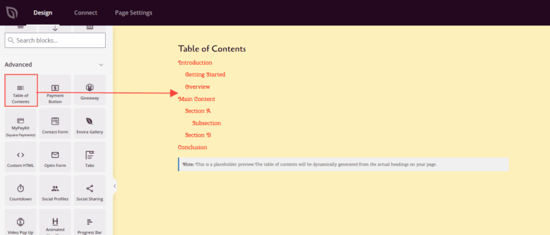 Under Design > Blocks, drag and drop the Table of Contents block into the desired section of your page. This block is typically placed near the top of your page content, after the introduction but before the main sections begin.