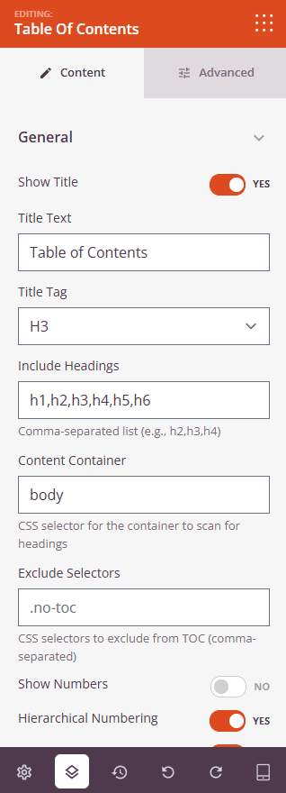 - Include Headings: Specify which heading levels to include in your table of contents using a comma-separated list (e.g., h2,h3,h4). This determines which headings from your page will appear as links