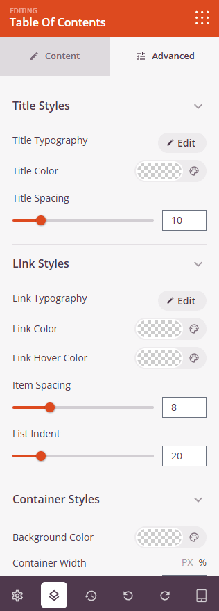 - Link Typography: Customize font settings for the table of contents links